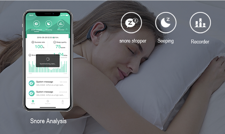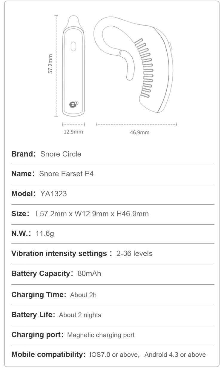 Snore Earset E4 is a physical anti-snoring device developed based on the principle of snoring. It monitors snoring through an intelligent snore recognition system, and uses a patented anti-snoring algorithm to accurately determine the snoring index of users. Upon detecting snoring, Snore Earset E4 physically intervenes with micro vibrations, which drive the nerve center of the brain to send out commands to tighten the muscles of the throat, thereby opening the airway to make breathing smoother. Snoring is therefore significantly reduced or completely stopped, all while ensuring undisturbed sleep.