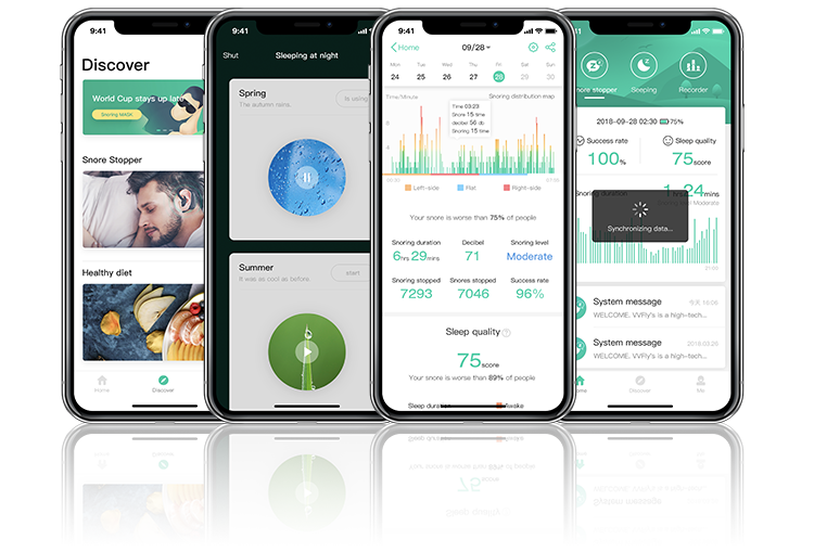 After syncing data, you can view snore data, intervention data, and sleep analysis report via the Sleeplus app, and keep track of changes in your sleep patterns.